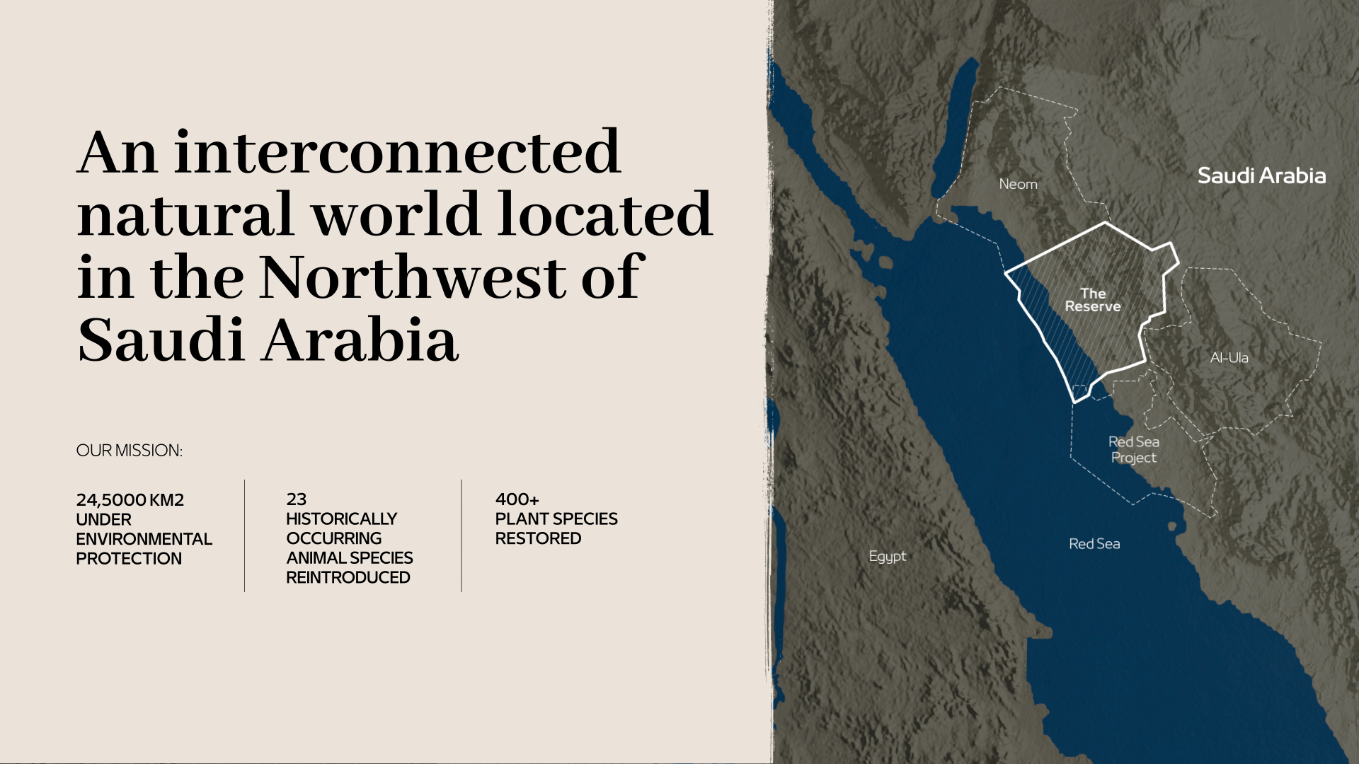 Prince Mohammed bin Salman Royal Reserve is home to dramatic landscapes, exceptional plant and animal biodiversity, and an 85,000-year-old rich cultural heritage. Covering 1% of Saudi Arabia’s terrestrial area and 1.8% of its marine area, it is home to over 50% of the Kingdom’s marine and terrestrial species.