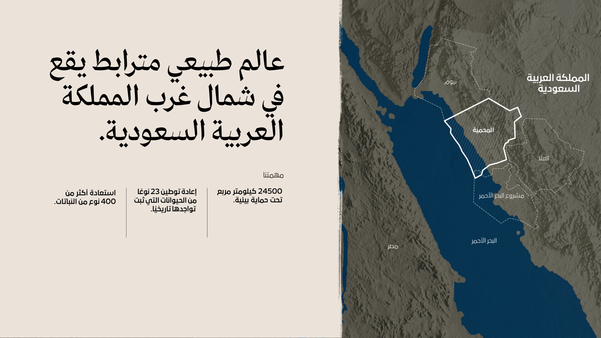 مناظر طبيعيةٌ آسرة، وتنوع فريد من النباتات والحيوانات، وإرث حضاري غنيٌّ وعريق تمتد جذوره لأكثر من 85 ألف سنة. لذا تسعى محمية الأمير محمد بن سلمان الملكية لحفظ ثروات أرضها الفريدة التي تغطي 1٪ من المساحات البرية في المملكة العربية السعودية و 1.8٪ من بيئتها البحرية، متميزةً بتنوع حيويّ ثريّ واستثنائي يعد الأكبر من نوعه في المنطقة، حيث يستوطنها أكثر من 50٪ من الكائنات البرية والبحرية في المملكة.