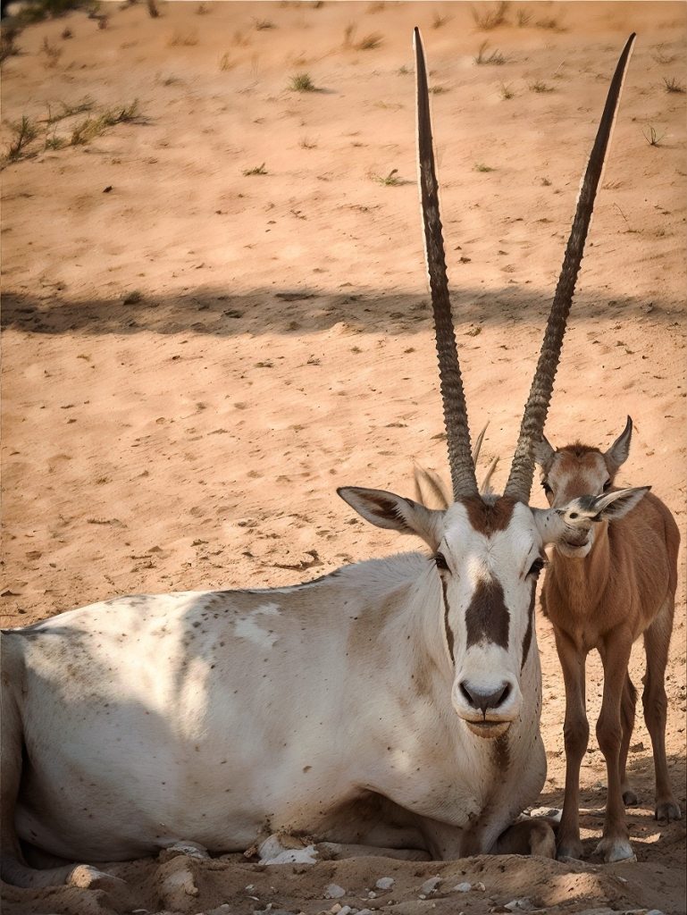 An Arabian oryx calf next to its mother in Prince Mohammed Bin Salman Royal Reserve