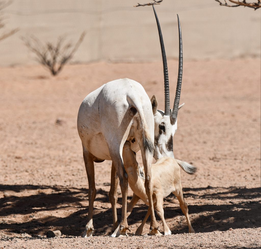 An Arabian oryx calf nurses from its mother in Prince Mohammed bin Salman Royal Reserve